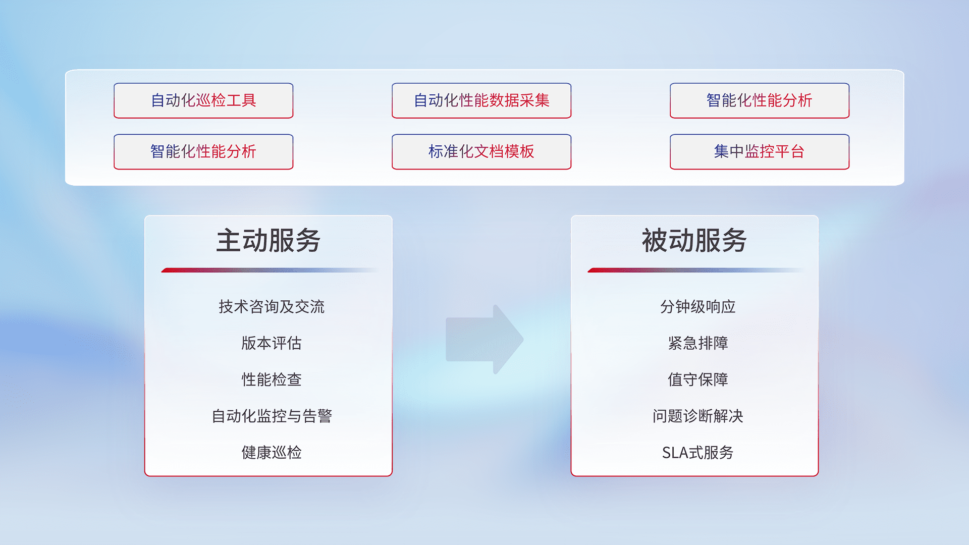 智能化工具和标准化文档,,,,保障服务质量,,,,提供主动服务(包含技术咨询、、、、版本评估、、、性能检查、、、、自动化监控与告警、、、健康巡检)和被动服务包含(分钟级响应、、、紧急排障、、值守保障、、、问题诊断解决、、、、SLA服务)。。。