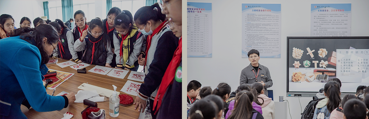在大学生活动中心里陈列了许多由生活中创生出的非遗文化展品,,,同学们通过观摩活字印刷、、、、拓印、、鲁班锁、、、、锡火烫印、、、、3D打印等精美作品,,,感受工业艺术的美与智慧。。。