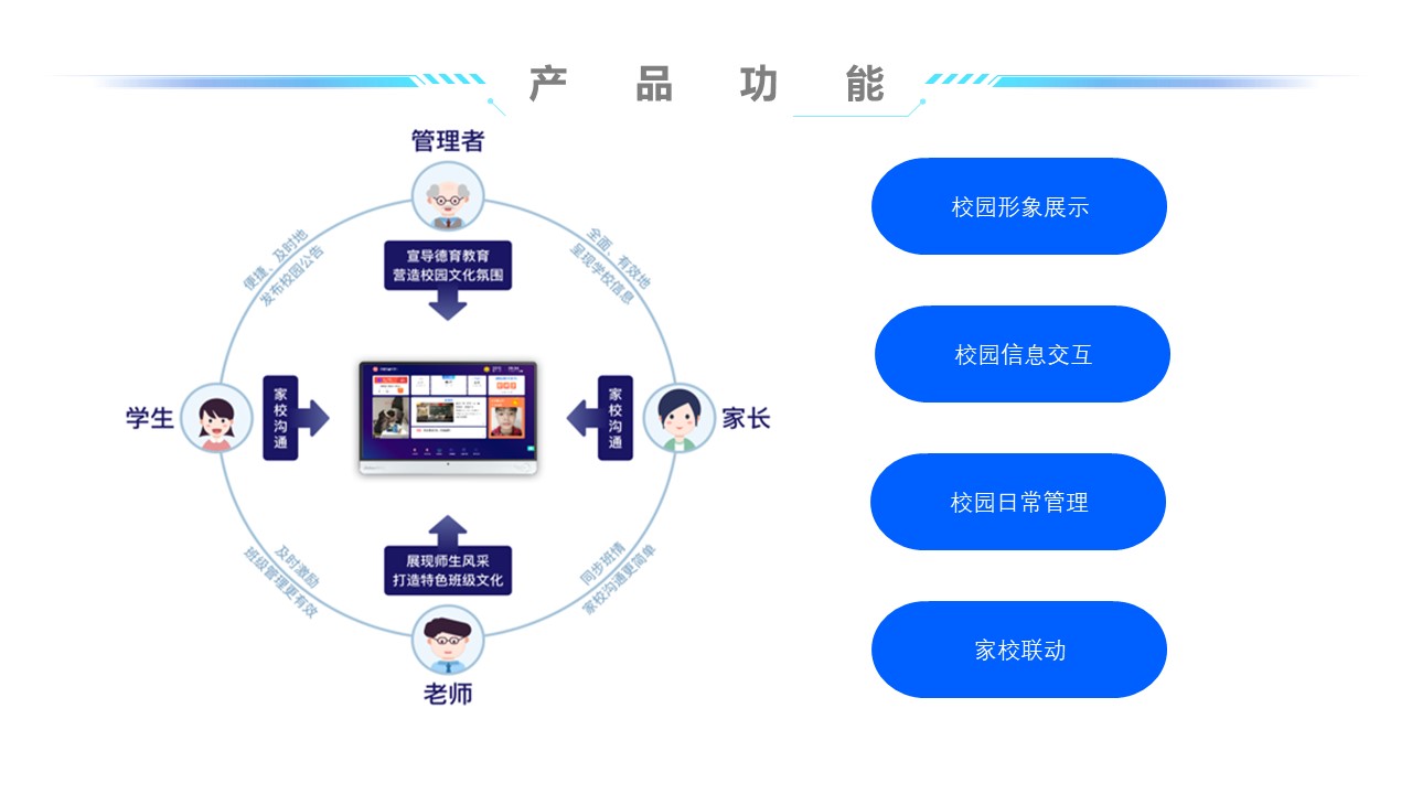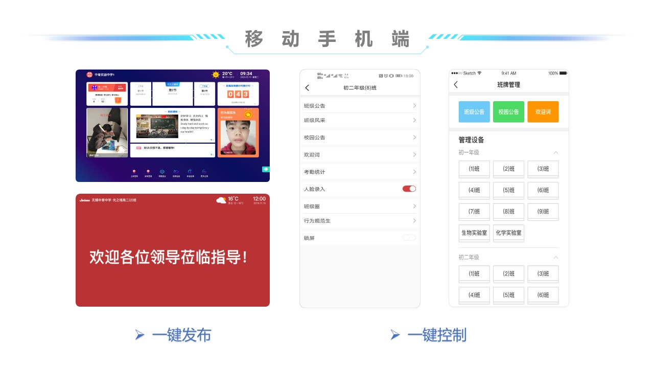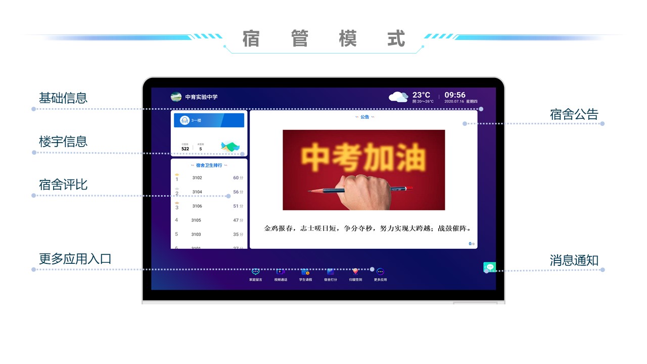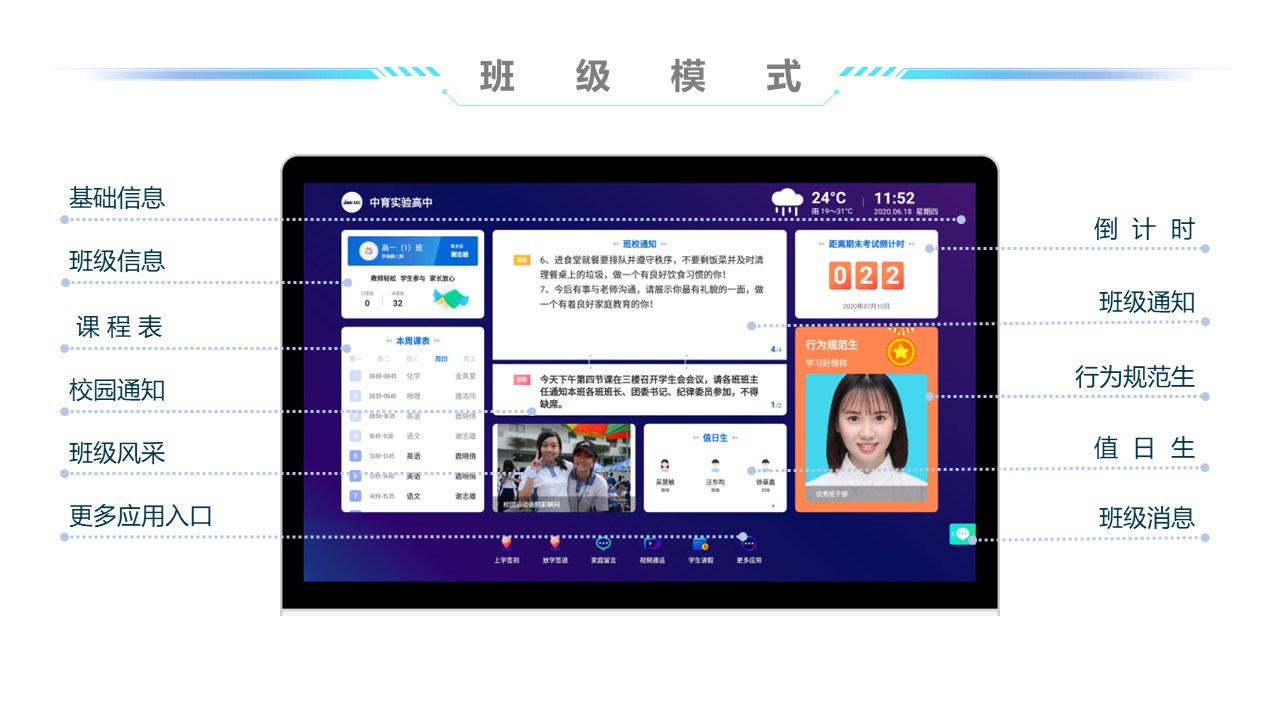 尊龙时凯智慧班牌系统由电子班牌、、、教师APP、、家长APP、、、后台大数据服务、、、拓展智能硬件五部分组成,,,,集班级文化展示、、班级公告、、走班排课、、考勤管理、、、素质评价、、资源管理、、、、弹性离校、、家校互联等应用于一体,,对接智慧校园平台,,,让校园管理一体化、、数据化。。。